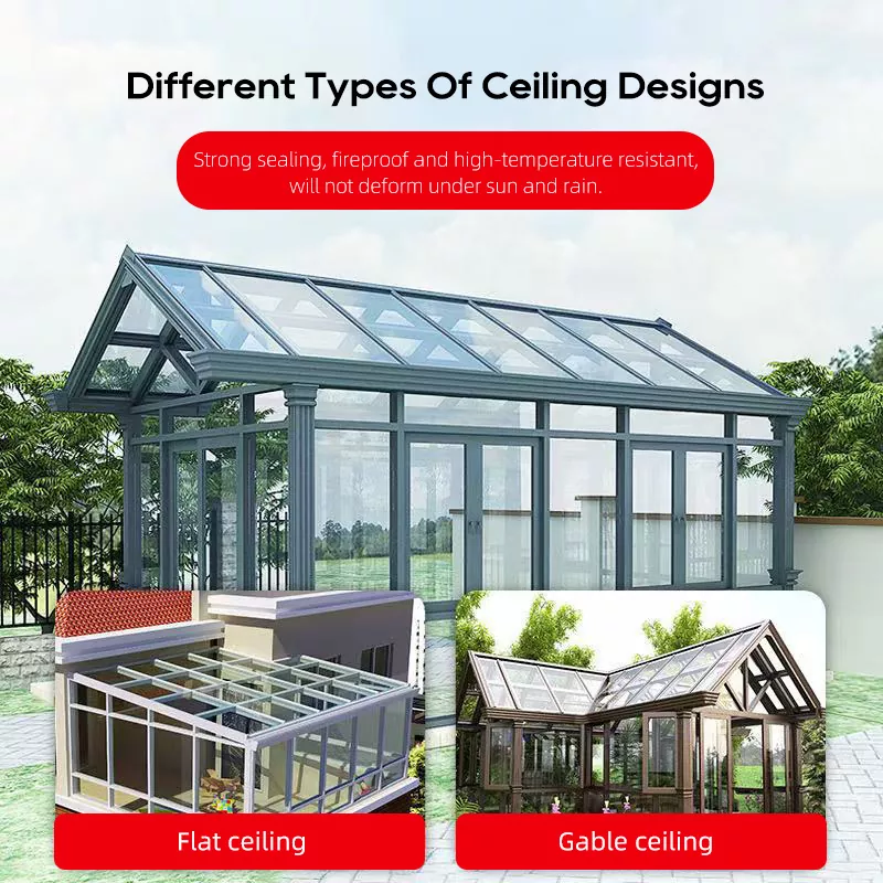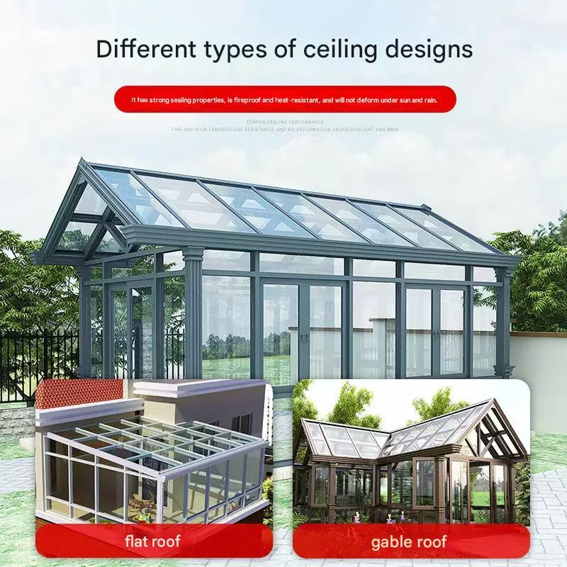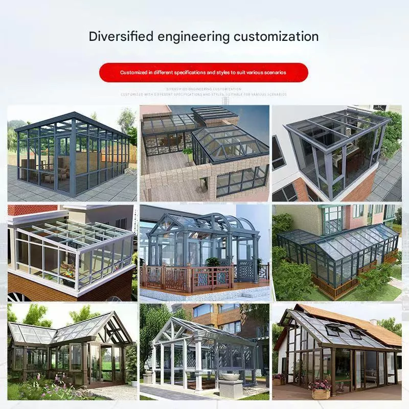 Solrummet antar en termiskt brytande aluminiumram + isolerad härdat glasstruktur. Ramen består av pelare, balkar och diagonala stöd, monterade genom ett modulsystem som stöder flera takstilar, inklusive sadeltak, platta tak och böjda tak.